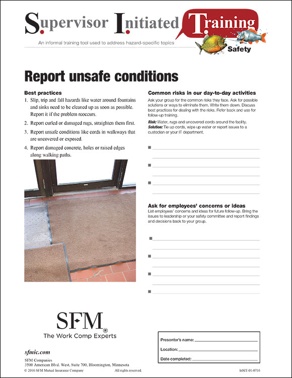 Our supervisor initiated training tools (also known as toolbox talks) are for supervisors to present to employees on specific safety hazards. Each SIT takes less than three minutes to present and reminds staff about important safety messages and procedures. Presenting them also gives your staff the opportunity to bring up concerns or questions.